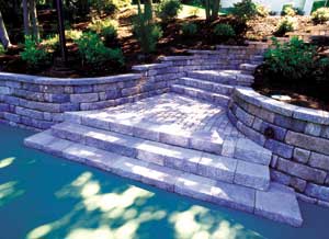 Functionally, the walls also meet the needs of holding up and back the significant amount of land not at the appropriate grade, and served the schedule well in the ability to quickly implement the product. In addition, the caps were used as pavers in many areas to continue the continuity of the look.