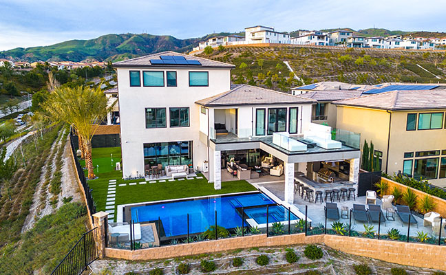 This resort-style residential backyard offers a luxurious escape from the busyness of daily life. At the center of this backyard sanctuary is an infinity pool, providing a stunning focal point that seamlessly blends with the surrounding landscape. The pool's design is perfect for a relaxing soak or an invigorating swim, while the sound of the water cascading over the edge provides soothing background noise. Adjacent to the pool is a spacious balcony, offering ample room for outdoor entertaining and lounging. The balcony's railing is made of sleek, glass materials and provides a clear view of the pool and the surrounding backyard. Here, residents can entertain guests, dine al fresco, or simply relax and enjoy the view. For a truly pampering experience, the backyard is equipped with a spa. This luxurious addition is designed to provide the ultimate in relaxation, offering a warm and inviting space for unwinding after a long day. Beyond the pool, balcony, and spa, the backyard is landscaped with a variety of drought tolerant plants and trees, providing a clean and serene environment. Stepping pad pathways leads residents to a private putting green equipped with fringe and 3 different pin placements.