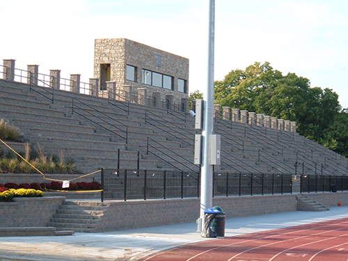Bleacher walls were built up before pavers were installed on the seat rows to avoid damage to the pavers during wall construction. Standard Versa-Lok cap units were used for seating. The center of the bleachers is the high point, so water drains in either direction.