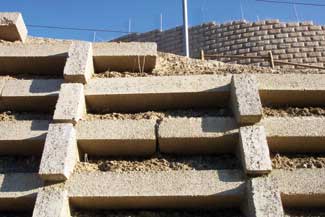Reinforced soil walls should be specified when the maximum height for conventional gravity walls is exceeded or when lower structures are surcharged by sloping backfills, live loads, and/or have poor foundations. A reinforced soil SRW is designed and constructed with multiple layers of soil reinforcement placed between the SRW courses and extending back into the soil behind the wall at designated heights and lengths. The geosynthetic (fiber mat) reinforcement and the soil in the reinforced zone acts as a composite material, effectively increasing the size and weight of the gravity wall system.
