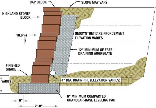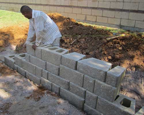 Place the second course of stones on the base course while maintaining staggered bond, and push each block as far as possible to ensure the correct setback. Fill all voids between and within concrete wall units with drainage aggregate. Use of a filter fabric may be required, which should be placed directly behind the wall extending from the bottom of the base course to the middle of the top course. Backfill with a minimum of 12 inches of drainage aggregate directly behind the block, and fill in soil behind the aggregate. Compact the backfill before laying the next course. For drainage design, place the drain tile as low as possible behind the wall, so water drains down and away from the wall into a storm drain, or to an area lower than the wall. Multi height retaining wall systems are innovative way of taking standard sizes of segmental retaining walls and creating new and different looks to the wall facing.