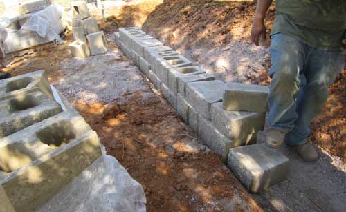 After reaching the finished height, establish a finish grade and check for surface drainage. To minimize infiltration of water into the top of the backfill area, add a minimum 6 inches of soil with low permeability (clay or similar materials). Leveling Pads & Installation The leveling pad typically consists of a crushed aggregate compactable base material, with a 3/4-inch maximum top size aggregate minus with fines. The pad must extend 6 inches in front and behind the first course of block and be at least 6 inches deep. Excavate for the leveling pad to the lines and grades shown on the approved plans, and excavate enough soil behind the wall for reinforcement material. The trench for the leveling pad should be a minimum of 24 inches wide and 12 inches deep for a 12-inch front-to-back dimensional block. Compact the aggregate and make sure it is level. A string line should be run along the back of the block to align the wall units when installing the base course. Use the highest MHRWS vertical thickness blocks only in the lowest course in the elevation of the wall. Place the blocks side-by-side, flush against each other, and in full contact with the leveling pad. Level the blocks front to back and side to side. Check the blocks for proper alignment.