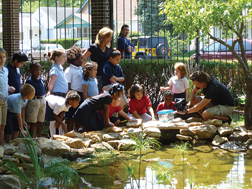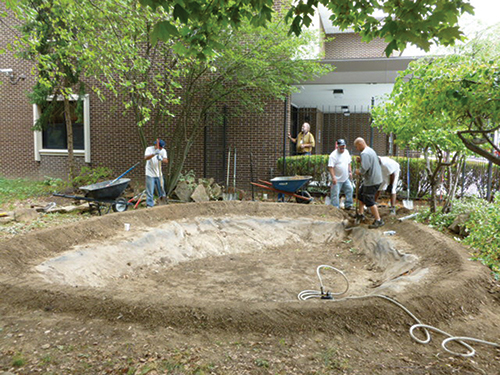 In August, Automatic Irrigation Supply Company donated pond, lighting supplies, design and installation work as part of a unique charitable experience in Indianapolis, participating in a landscape revitalization project at a local elementary school. Landscape contractor Earth-Wood Arts offered free design, labor and gravel to get the project started. This contribution blossomed into donations of tons of stone, plant life, mulch, water and more from numerous contractors and other businesses in the area. When project coordinator Maria Crutchfield came to AIS seeking help, Rick Hughes jumped on board to take the project to the next level. Hughes worked with local water features representative Trent Caldwell to secure donated pond supplies for this project, including a medium pond kit (with underlayment fabric, rubber pond liner, skimmer, and pump), an IonGen algae defense system, Kichler outdoor LED accent lights, and of course the required manual labor with plenty of shovels and landscape tools.