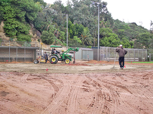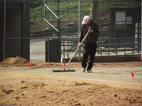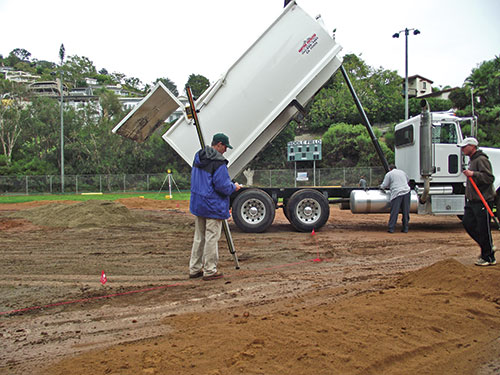 Following the completion of the irrigation system installation, Linton employed a dump truck to deposit 10 yards of sand and 25 tons of in-field mix; The infield mix was a special blend that is screened to two millimeters, and consists of decomposed granite, clay, and a stabilizer product made of sand, silt and clay.
