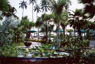 Hotels are a fun experience and this design brings a sense of relaxation and pleasure. This is what you feel when you first enter the hotel. The exterior and interior design are brought together with the new planting in the courtyard space. These were carefully placed not to block the view of the ocean, so the picture window works out beautifully. The coconut palms were planted close to the garden rooms to frame them. The smaller scale species such as Washingtonia palms and foxtail palms are planted in the center; they don?EUR??,,????'???t block the views but bring out the texture of the plantings. Other spectacular plantings are specimen material: Bismarkia palms, Butia species and a multistem ponytail palm. Other than having a continuous flow of the smaller (lower) plantings throughout the courtyard, careful thought was given to place rare specimens throughout the design for those little surprises, such as the embedded planter of the pool ?EUR??,,????'??+ the specimen palm (Phoenix reclinata.) ?EUR??,,????'??+ which can be viewed from practically from all areas of the pool space. Doel found three beautiful calderas that were to be filled with water to house fish lotus flowers. These were placed in strategic spots and complimented the space wonderfully.