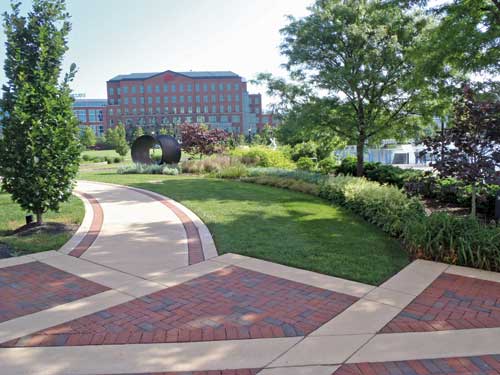 The landscape architect took advantage of the three-foot grade change from the plaza and main park area to the existing riverwalk to design an amphitheater, which opens to the east with views to the Christina River. The turf is tall fescue. The trees (left) are Quercus x robur "Crimson Spire'. The segmental walls are by Unilock. The lighting is Holophane city of Wilmington decorative light fixtures with Utility Hamilton poles.
