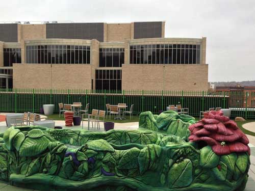 More than a decade of research in therapeutic and environmental design has made clear that healing gardens and play areas in children's healthcare facilities can decrease stress and increase healthy outcomes. When the Children's Hospitals and Clinics of Minnesota, St. Paul campus chose to add a new six-story tower, the lack of available space meant the facility's popular healing garden had to go. But the parents, patients and staff made it clear to the hospital administrators that the garden was more than just a pleasant view from a patient's window. "The healing garden was important to our staff, parents and most importantly our patients, [and] we knew we needed to create a space for a new one," said Jim Leste, the hospital's director of environmental operations. "Space is tight, so it made sense to put the new healing garden play space up on the rooftop." The project's native wildlife was initially challenged by the weight limit of the hospital's rooftop, but after the structural engineer cleared construction, San Diego-based healthcare design firm Aesthetics Inc. was hired to develop a plan to meet the needs of the clinical teams, the families and the children. A team of hospital committees, parental advisory groups and Aesthetics designers selected the garden's native wildlife theme, and the design was a collaboration between Aesthetics, artist Ken Goldman who designed the animal structures, and Cre8Play, whose artisans brought the sculptures to life. Structural elements include a decorative privacy fence, a labyrinth, native plants and flowers, a Rose fountain with a push button for the kids, deer with an ear talk tube and other nature related music and play features. Elements were placed to create distinct areas for quiet reflection and active play, group and individual seating, and activities for patients, visitors and staff.