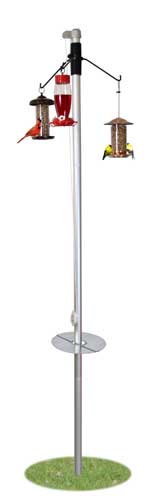 FeedSavr™ keeps squirrels, deer and other unwanted critters away from bird feeders and houses. Pull on the rope to raise up to three feeders and or houses up the Jenlis pole and secure them out of reach. The Squirrel Deflector creates a barrier that prevents critters from climbing the pole. If they try to get around the barrier it tips and they fall to the ground. Lower your feeders and houses for easy filling and cleaning. The three section 10.5 foot aluminum pole can be erected in your yard or on your deck (deck mount sold separately). Patent Pending, feeders not included.