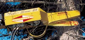 My source of amnesia would come in the form of Sheyenne Tooling & Manufacturing's Tele-Saw. This tool could save me all sorts of headaches, literally and figuratively. Now you are probably wondering what's so great about this tool. After performing a swan dive off a ladder with a running chainsaw in hand, I can see the benefits crystal clear. (In case you are wondering, I managed to keep all my body parts in the same condition I started with. My britches are a different story.)
