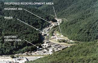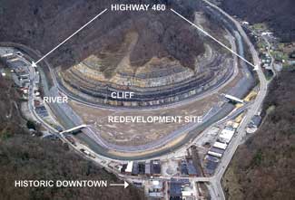 As one drives to Grundy in southwest Virginia it is easy to see why parts of Appalachia remained isolated until the early part of the last century. It is an extremely old and dissected landscape, carved over the millennia by small streams and rivers, the result being very little level land. An important coal mining region, communities were typically built along streams. Grundy grew up along the Levisa River. This unfortunately made Grundy susceptible to flooding. A particularly devastating flood occurred in 1977. The U.S. Army Corps of Engineers and the Virginia Department of Transportation teamed to develop a $28.8 million flood proofing plan called for the creation of a 13-acre flood-safe redevelopment site, carved out of the adjacent hillside to replace a portion of the town that was in the flood plain and could not be protected in other way. Enough earth and rock were removed to fill 68 football fields to a height of 20 feet.
