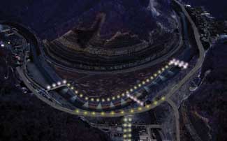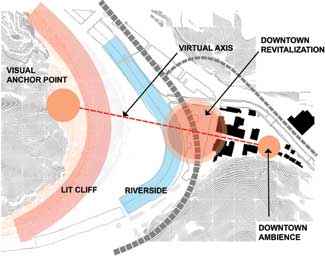 The proposed lighting plan, really more of concept, had five key components: 1) a unifying element that consists of a linear series of lights along a pedestrian walkway that visually ties the historic district to the redevelopment district; 2) a centrally located, sculptural light feature that will become the focal point in the town and contain lights that will mark changes in the river’s water level and the seasons; 3) lighting to enhance a proposed river promenade; 4) dynamic lighting of the cliff and 5) a laser light exhibit.