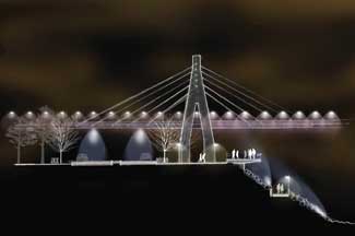 Dispersed between these will be smaller features similar in character and design to tie the features into a linear, visual element in the landscape. The lights will be part of a pedestrian walkway connecting the two areas of town. A pedestrian bridge will be located where this linear feature crosses highway 460 and the river. The bridge will be a suspension bridge. The main tower that supports the bridge is the sculptural element that will become the focal point for the town (the second key component of the plan). Lights on this focal point will change to reflect three types of time. The first is seasonal change. The color of the lights will change during the different seasons of the year (winter, spring, summer and fall). In addition other lights go on and off to reflect the level of the water in the river. Lastly, the lights on the tower will change to reflect certain special occasions during the year. This central light feature (bridge tower) is dynamic and always changing, providing the passer by, whether on foot or in an automobile, with something new to look at.