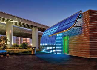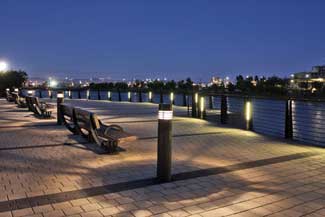 Located along the building side of the esplanade, small louvered BEGA steplights recessed in the low walls at each bench seating niche provide a small accent of light to identify these resting spots at night. Compact fluorescent sources were also chosen here for energy efficiency and long lamp life.