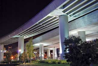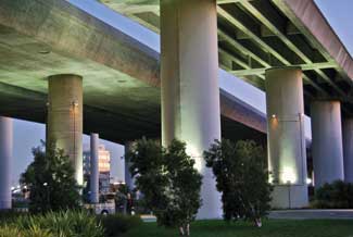 The biggest challenge for this end of the park began with the existing concrete forest of freeway support structures and ramps. However, these same structures viewed at night under ambient moonlight seemed to fade into the shadows. Therefore, our most important lighting challenge was to design a lighting system for the park that encouraged park enthusiasts to feel safe.