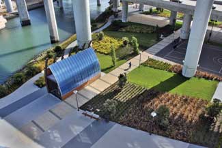 In terms of park amenities, these include: a linear waterfront esplanade with a series of celebrated overlooks; a kayak and boat launch; a dog park; basketball courts; volleyball court; tennis court; restroom and maintenance facilities. With the park being approximately three city blocks long, design and construction was divided into two phases. Notably, the most unique aspect of the park is the site at the west end, slated for the sports park component and described here as part of Phase Two.