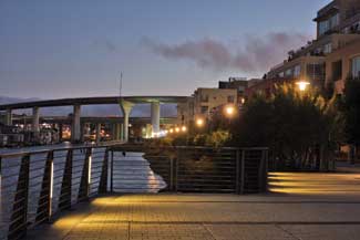 Our lighting design process in collaboration with Marta Fry Landscape Architects and Catellus began in early 2000 with the design development of Parcels NP1 and NP2, named here as Phase One. This portion of Mission Creek Park North includes most of the esplanade and overlooks which are located adjacent to the mid-rise residential buildings being constructed at the time. Phase One also includes the prominent 5th Street Overlook, a mid-block park for residents to enjoy that also conceals and protects San Francisco’s pre-existing outfall structure and pump station mechanics.