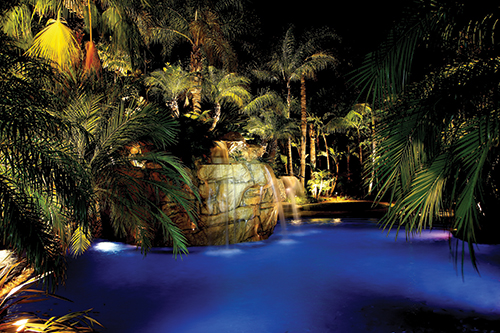 The front and back yards have a tropical resort backdrop but the custom rockscape and specimen palms got lost at night due to the poor original lighting design and the lack of alterations to that design as the landscape grew and changed. "Usually the original design is not done by a professional lighting firm and many key elements are missing," Evans says. "When I see a project with lighting already installed I almost always suggest changes to accent the unique features of that property." Fortunately for Evans, the existing lighting system had many high quality brass and copper fixtures that could be retrofitted to LED and re-purposed, which he suggested to his customer who agreed.???(R)???AE'?N????e'?N,A+Evans also recommended enhancing the design by adding many more fixtures to light up the missing key elements. So after redesigning the system and performing a full maintenance and retrofit of the usable fixtures, Illuminated Concepts handled the installation. The new and retrofitted fixtures totaled 119 in the front yard and 131 in the backyard. This included new bullet lights from Kichler and Lightcraft, and wall lights from Laguna Lighting, a company that Evans is developing. Existing fixtures included bullet lights from SPJ, bullet and path lights from Auroralight. One other task was to deactivate most of an extensive fiber optic system, which was now pointless since the enhanced lighting would overpower the low lumen fiber lighting. However some fiber projectors that illuminated stairs were maintained so that they could remain operational. Bonus Features As a service to all his customers, Evans provides a spreadsheet that breaks down how much money they will save by switching to an LED system. This homeowner's annual savings in reduced electrical and maintenance costs will be over $5,000 a year by Evans' calculation. On top of that, the long life of the LED lamps saves money when compared to halogen lamps, which have to be replaced much more often. He figures that over the life of this system, that would amount to 3,750 lamps. Evans likes to employ a technique he calls "free real estate lighting," which is illuminating trees beyond the yard to essentially extend the yard. In this instance he employed Kichler 15752-BBR 12.4-watt bullet lights with 35-degree floods to do the job. A crew of three installers and a project manager completed the entire job in two stages. The backyard took about 2 1/2 weeks. After an intermission of a few months, during which the homeowner assessed their performance, they were brought back for an encore and worked 1 1/2 weeks to brighten the front yard. Evans reports that no special equipment was involved but the installation did make use of Spears dry splice connectors, which are typically used in irrigation installations, to create solid wire connections that are sealed from the elements. Besides the size of the project, the biggest challenge was burying the lighting cable, which was made more time consuming by all the roots present due to the maturity of the plants. The final production received excellent reviews, as the creative and technical efforts of Illuminated Concepts turned out results that really put on a show.