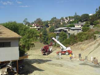 Initially, the entire site needed regrading to recompact the soil and thereby stabilize the site to prevent a mudslide recurrence. To accomplish this, huge amounts of dirt had to be shifted or removed and soil cement keys were placed in a terraced effect to solidify the terrain. The challenge was to grade the project efficiently while minimizing the amount of dirt to export while considering the load of soil to retain on the site and how this would impact the size and cost of the necessary soil cement keys. Removing the dirt proved to be the least expensive strategy and had the residual effect of improving the homeowners?EUR??,,????'?????<????????????EUR??,,?? views.