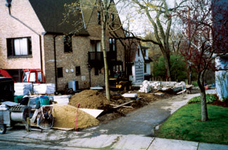 When we designed the paving areas, we paid careful attention to the grades and drainage as all external paving areas must be pitched to not hold water. In our climate here in Wisconsin, you cannot have puddling because it might lead to staining and/or icing conditions. The normal pitch on brick or stone paving is one inch for every five feet of paving. On this particular project we did not want the patio to slope from one end to the other across the line of site because that would make the patio and fountain look crooked. We did not want to slope the patio to the house or to the masonry wall, so we pitched the patio to the center, giving us the ability to keep all the outside edges of the patio level.