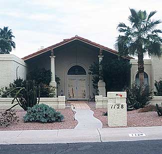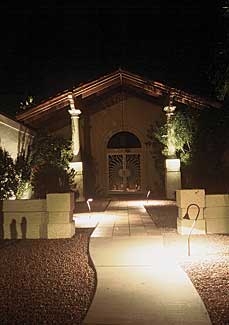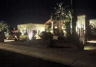 First, the design consideration was to accentuate as well as elevate the front entry to the house. We did so by uplighting the two columns on either side of the door and catching the roofline above them. In conjunction with that, traverse lighting along the walk from the street to the entry door was essential to safely lead foot traffic to the house. Next, various focal points were defined as a Mexican Fan Palm, a Palo Brea, two Italian Cypress trees and several cacti within the front yard. These were up-lit using various fixtures and different lamp wattages and beam spreads. Several color shrubs against the house (Bougainvillea) were softly lit to bring out their flowers as well as cast interesting silhouettes on the walls. Because of an adjacent street light in front of the property higher wattage lamps were used in many instances to overcome the intrusion of this light source. To the naked eye this technique worked well, although the effect of photographing the project produced glare.