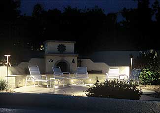 For the rear yard, the client desired special control over sections of the yard for various moods and functions. The seating area by the fireplace has downlit from tall Tiki style fixtures for eating or reading but could also be lit as a true Tiki-torch. A separate manual switch was provided for these fixtures so the client could override the automatic function if desired. The remaining lighting in that area is subtle but provides great ambience without interfering with star gazing. However, the client also has the option of shutting these off completely should the torches and fireplace be desired, creating a romantic setting.