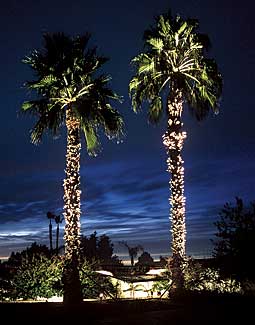 The opposite end of the rear yard has two tall Mexican Fan Palms which were up-lit with 50 watt lamps to hit the fronds as well as graze the trunks along their length. A shielded fixture was also used to eliminate stray light. Again, some color shrubs adjacent to these palms were highlighted for depth and texture.