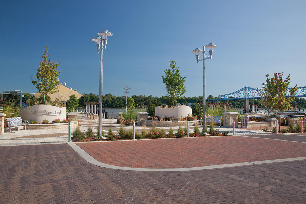 Project Description: The creation of a people street or festival street for the City of Owensboro was a key component of the Smother's Park project which encompasses five blocks on the Ohio River. Besides creating a safe place for pedestrians, the landscape architect needed to design and detail the street to sustain busy vehicular traffic while complementing the newly created park. Clay brick pavers were selected early in the process to fit the character of the downtown as well as stand the test of time. One of the challenges was creating a flood-resistant pavement. The bricks were detailed with a concrete base and sand bedding while others were installed with bituminous bedding, a membrane and the bricks.