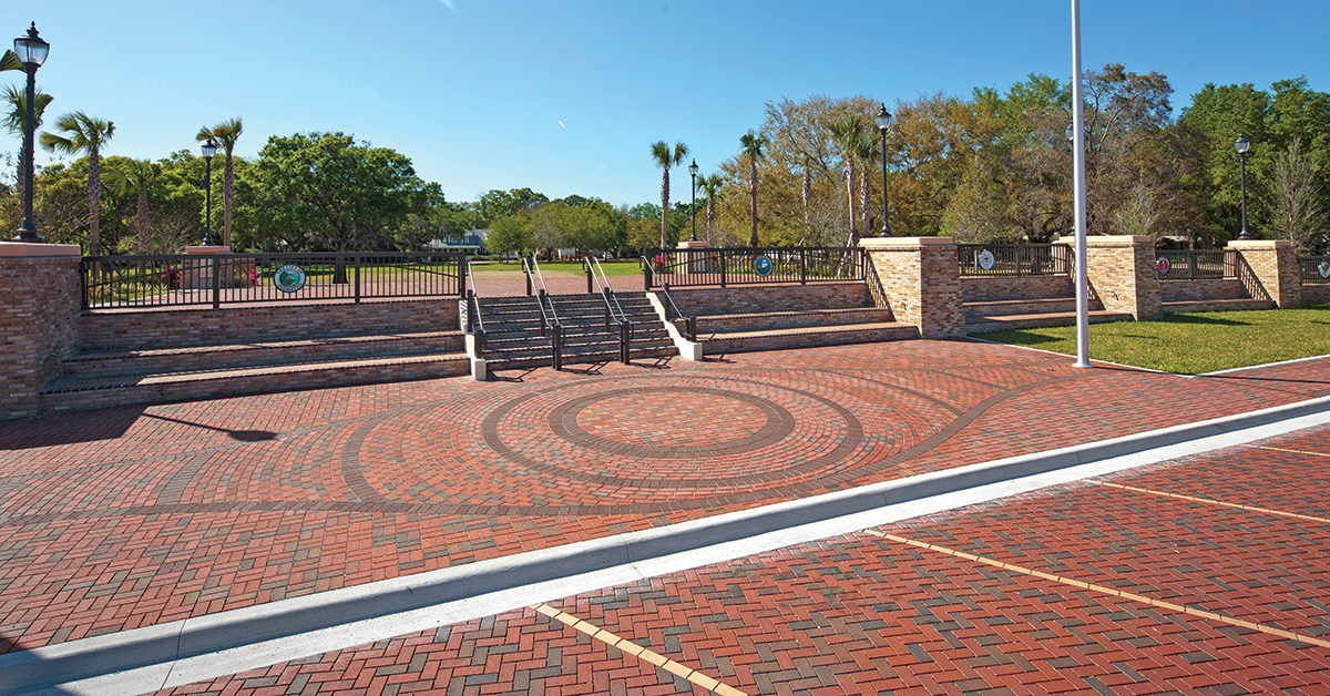 Project Description: Palmetto, Florida is a small town on the Manatee River on the west central coast of Florida. Sutton Park, a former high school football field, with adjacent Lamb Park, became a central green-space corridor. The park is surrounded by historic homes, a library and a church. Named for a resident killed in the Vietnam War and dedicated to all military veterans, the park is quickly becoming the heart of the community. Families enjoy walking and bicycling in the park and it is used for outdoor movies and concerts. The park is part of a larger goal to increase the use of the downtown core by creating an inviting family-friendly atmosphere, in this case a place that reflects the town's history while incorporating sustainable designs into the process. Along those lines, the designers specified permeable clay brick paving, LED lighting to reduce energy costs and drought-tolerant landscape. Permeable clay pavers were selected because their use minimizes long-term maintenance costs and their appearance helps create a sense of tradition unique to Palmetto. Concentric circles and other elements subliminally guide users to various areas and separate bicyclists from pedestrians. One specific emphasis was on reducing stormwater runoff, which caused flooding that flowed untreated into the Manatee River. StormPave pavers from Pine Hall Brick Co. were specified because they provided a way to treat storm water on site, were durable enough to withstand pedestrian and vehicular traffic, and were inexpensive to maintain. The permeable paver system has worked as planned during several significant rainfalls, including a tropical storm.