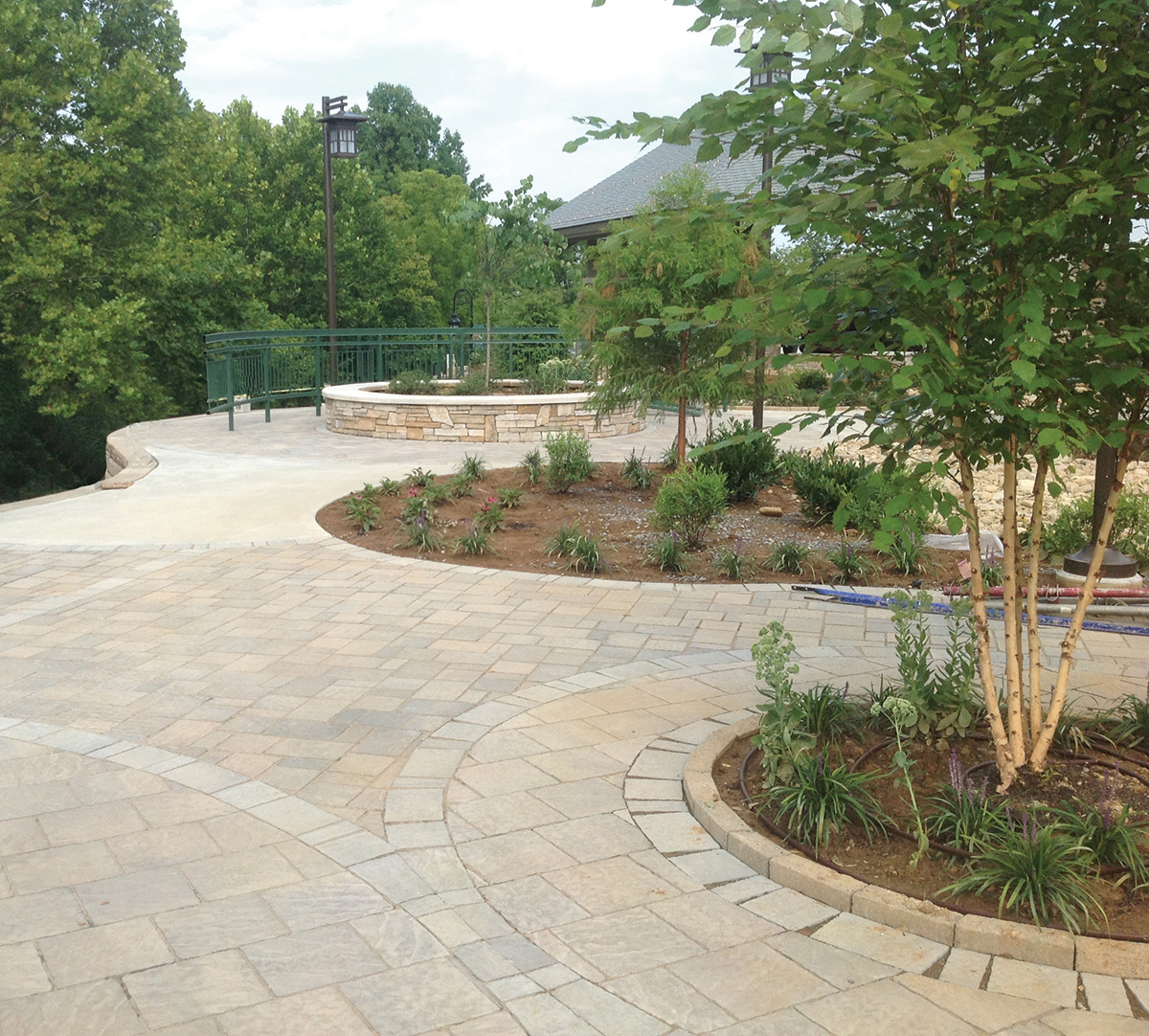 Project Description: The project used approximately 9,500 square feet of Belgard Aqua brick pavers with a blend of 50 percent Potomac and 50 percent Fossil Beige for the permeable parking lot. The units were placed in a 45 degree herringbone pattern with a soldier border and parking lines in a sailor cut into the field with Aqua brick limestone. The patio areas were approximately 12,000 square feet with the borders and cut lines using Urbana 3-piece pavers in Ardennes Grey. The circle areas uses Urbana large square Potomac on a 45 degree angle with Urbana 3-piece Ardennes Grey. The borders around the planters have permeable pavers allowing the water to flow into the planters. Most all of the border and planter areas were cut on a radius or angles with miters at all corners. Some of the edge restraints were created using approximately 600 linear feet of Celtic curb. There were approximately 10,000 square feet of walls installed using Alan Block Classic block.