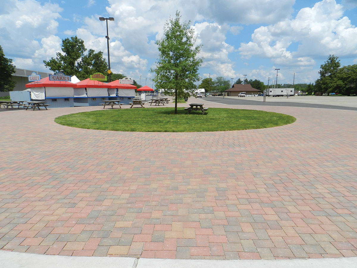 Project Description: A 300-foot-long boulevard known as the Cardinal Corridor welcomes visitors to the 160th Ohio State Fair. This project began a multi-year initiative to beautify the Ohio Expo Center by transforming acres of pavement into grass and trees that provide shade and reduce stormwater runoff. Nine trees were planted in runoff-reducing cells along the center of the newly created corridor. Surrounding the cells, grass pavers with sod create green space. The crowning feature of the boulevard is 25,000 square feet of Washington 21 permeable pavers. This collects stormwater runoff from the surrounding pavement. Underdrains below the paver fields connect to the cells and provide filtered water to the tree roots. The system can store approximately 20,000 gallons of water, or the equivalent of a 1 inch per hour rainfall on three quarters of an acre. The red, buff and charcoal colors create the autumn blend to complement the Cardinal Corridor entry feature. The pavers were laid in a ninety degree herringbone pattern to accommodate vehicular traffic. A charcoal colored soldier course around the center grass area provides a visual frame that ties the entire space together.