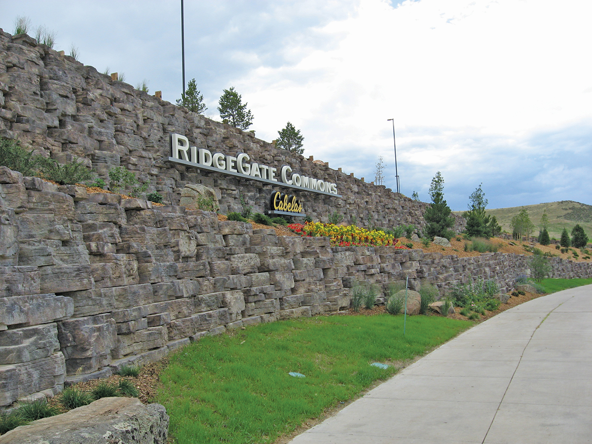 Project Description: The retaining walls at RidgeGate Commons provide a dramatic entrance feature for the new Cabela's store south of Denver. The 30-acre site is set into the sloping face of a high ridge overlooking the entire metropolitan area. Over $3 million of retaining walls were required since the pad had to be "benched" into the existing natural ridge. The walls, located at the front and back of the site, are over 30 feet high. The front retaining walls included over 20,900 square feet of segmental concrete wall units manufactured by Signature Stone. This retaining wall system is Rosetta Outcropping by Basalite. This is a specialty wall system incorporating massive gravity blocks along with geofabric reinforcement. The blocks have varying dimensions with a stone texture on the outside face giving them a random, natural look.