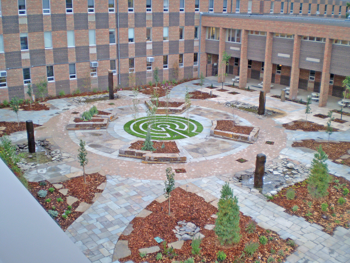 Project Description: This project's goal was to create a space for students, faculty, patients, and alumni to enjoy. The addition of a wing to an existing building produced a courtyard next to the university's world-class chiropractic school. This space had to offer "naming opportunities" that the university could sell to alumni and students, so all pavers had to be removable for engraving the names of donors. The installation occurred while classes were in session. Construction equipment access was through the existing parking lot and that space was shared with other contractors, students and faculty parking. The initial layout was critical on this job because of the extensive conduit sleeving required to accommodate irrigation and low-voltage lines. Another consideration was the thickness of all walkway materials installed; a total of 6 different materials with 6 different thicknesses had to be taken into account when laying the base and bedding sand. Four basalt stone waterfeatures required a 75-ton crane to lift and place the 1-ton to 3-ton rocks after installing the sidewalks.