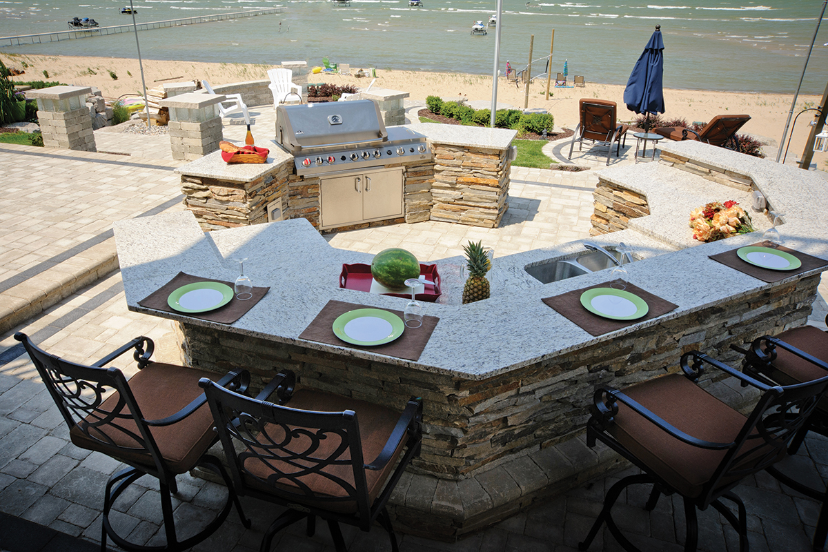 Project Description: This hardscape project was constructed on the beach of Lake Huron in Michigan. The house and landscape began on an empty lot between two existing homes. We addressed elevations, proximity regulations with neighboring homes, construction deadlines and clients living in another state. The clients required an outdoor kitchen, firepit, shower area, adequate sun bathing area, shade for comfort when entertaining guests and easy access to the beach. Our hardscape team met challenges with building coordination of the home and sharing space with the home construction crews. This project began in March so the wind and weather caused difficult working conditions with the site facing the open water.
