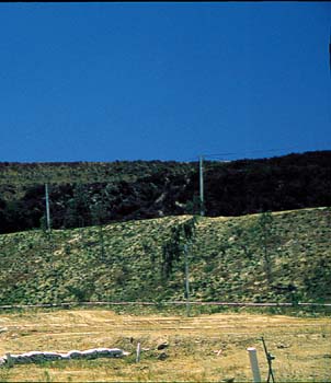 To control erosion on the erodible soils, a 20-lb. per acre mixture of two annual grasses - California brome and small fescue - plus 200-lb. per acre of starter fertilizer and 500-lb. per acre of EcoFibre a wood-fiber mulch were applied in October 1997. Then, EcoAegis, a bonded fiber matrix, was sprayed over the seeding at the rate of 3,400 lb. per acre.
