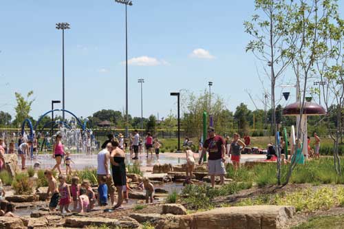 The play area and splash pad at Family Sports Park in O'Fallon, Ill., has been a signature community destination since opening in 2012. Designed by Planning Design Studio (PDS), the two-acre adventure play area is located within a 200-acre sports park in O'Fallon, located about twenty minutes east of St. Louis. The site provides an oasis of play activities for all ages, kids and adults alike. The "adventure play" area combines hardscape, lawn, dry areas, wet areas and multiple spaces and levels within a 400 by 200-foot area. The play area includes a splash pad with interactive spray ground equipment, a large group events pavilion, two traditional playgrounds with special features and two water stream features, all of which combine to create an aesthetic improvement to the the area that draws adults, parents and children of all ages.