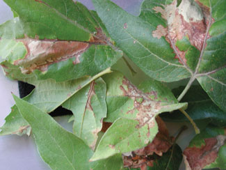 Anthracnose diseases are caused by fungi that are capable of infecting stems, leaves, branches, and fruits of a wide variety of deciduous trees and shrubs. These diseases can be found throughout the eastern United States, and the symptoms of these diseases are more severe in years of extended cool, wet spring weather. Anthracnose pathogens overwinter in leaf debris and produce spores in the spring that are carried by air currents to young buds on the plant. Leaf infections cause necrotic spots, irregular dead blotches or necrotic lesions, and buds are often invaded and killed. Twig lesions often expand and may girdle the twig entirely, causing death of the parts beyond the lesion, and cankers form on the branches, which in turn girdle and kill the branches. Anthracnose diseases can be controlled by destroying plant materials and debris in which these plants overwinter, and trees that are severely affected can be sprayed with fungicide containing chlorothalonil or propiconazole in the spring before bud break.