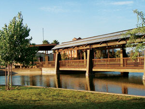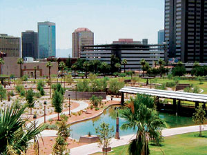 The Phoenix Green is 30 acres of rolling grass terrain, meandering walkways and clusters of trees. The raised walkways follow a canal that feeds the lake and provides water to the grass fields of the Phoenix Green. This area of the park provides a shady oasis with a mix of larger-scale deciduous and evergreen trees that provide a backdrop for the entire site. The Phoenix Green, completed in 2002, also offers many picnic ramadas.