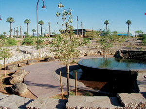 The lake areas were an additional challenge for landscape contractors revealed Bornhoeft. Almost three acres of the property is devoted to manmade lakes. The three water elements are found in different sections of the park. The water for the lakes comes from the Salt River Project in the nearby Arizona Canal. The canal is piped into the site and is used for flood irrigation for the northeast portion of the park. The rest of the park uses water pumped from the lakes for irrigation.