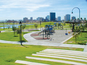 The 15-acre Neighborhood Park on the north side of the park features a playground, two half-court basketball courts and a sand volleyball court. Ramadas provide shade for picnics and parties and provide shelter for parents supervising their children. The edge of the Neighborhood Park is marked through the use of low walls, grade changes and plants.