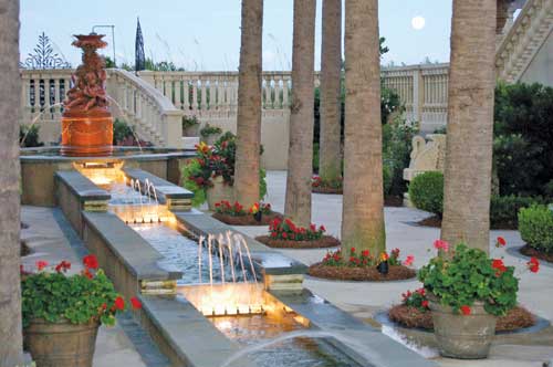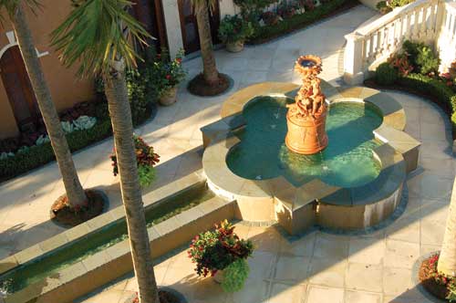 The fountain terrace has a palm allee with a central water rill terminating on the primary fountain with antique sculpture. Manicured landscaping, dramatic lighting and custom iron and stone features surround this space. This main fountain, with its linear rill and terraces, ends with an antique terra cotta cherub sculpture (provided by the client from their travels) in a quatrefoil-shaped basin. The fountain terrace is paved with Macedonia limestone and bluestone copings. The cherub fountain with its night lighting provides a focal point that can be seen from many vantage points in the homes. The ocean side garden features pool areas with a hand-carved fish fountain. Tabby paving pads set in lawns provide for alternative seating areas around the pools and hot tub.