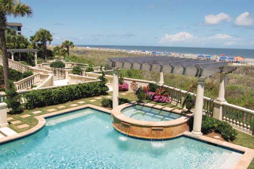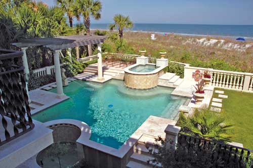 The main challenge for the landscape architect was to reach this same level of luxury with the outdoor design. WPi managed to integrate a 2,000-square-feet alfresco living space into dramatic ocean side pool terraces, spa and garden areas on the ground floor of each home. High levels of detailing and craftsmanship are evident in each home?EUR??,,????'?????<???EUR?s interior and exterior spaces. Stella Del Mare?EUR??,,????'?????<???EUR?s convenient mid-island location is adjacent to a popular public beach park and special consideration was given to screening, which included craning in a forest of 25 ft. tall pines and planting them between the two properties. The outdoor design also faced the challenge of maintaining a sense of intimacy for each home, while still building an overall sense of community. The master plan incorporated a private pool area for each home in addition to giving homeowners direct access to common amenities.