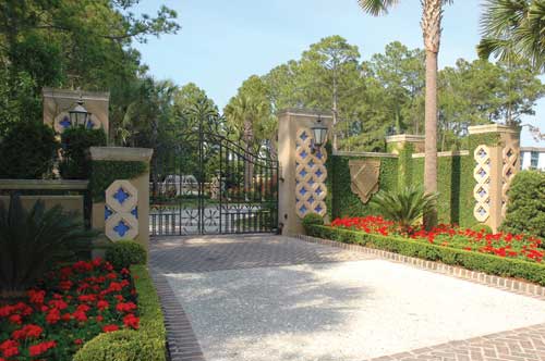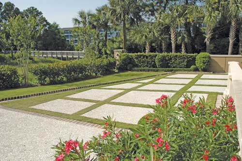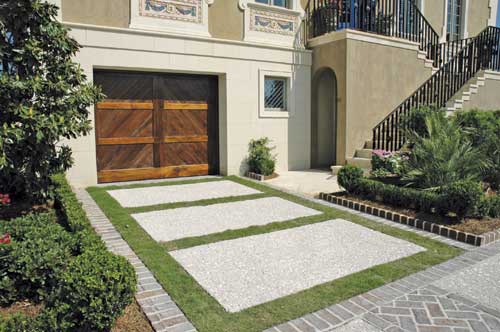 The garage entries and parking courts (right) are an exposed oyster shell aggregate trimmed in sod and surrounded by lowcountry brick. Blood-red trumpet vines brighten the space.