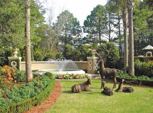 The lion garden features a carved fountain face representing the north wind instead of a lion, providing an interesting topic for conversation. One of the goals of the design was to provide opportunities for owners to share stories about travels providing history and character to the community. Custom wrought-iron gates were used at beach access points maintaining privacy. Native dune plantings were placed along the ocean side to improve aesthetics, health and diversity of the dune system.