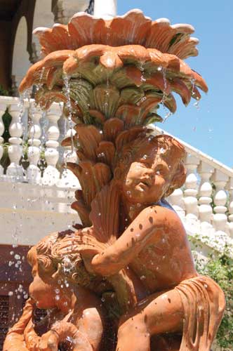 The Fountain Terrace terminates at an antique terra cotta cherub sculpture fountain with a quatrefoil-shaped basin. A palm allee borders the terrace.