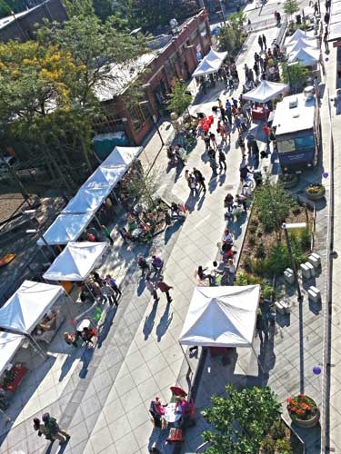 "Its sidewalks were narrow, and the existing trees, pavement and street furnishings were uninspiring and in poor condition," SvR Design Company said. One traffic lane and one parking lane were reclaimed for park use. The road surface was elevated to the level of the sidewalk, creating a single continuous surface, except in the spots where Bell Street intersected with crossing avenues. "Cars arriving from the perpendicular streets must slow and rise up to the park level, signaling entry into a special, pedestrian-oriented zone," SvR Design said. "The continuous level pavement encourages pedestrians, cyclists and automobiles to share the space." Finally, the park and street elements were mixed with pavements, planters with lush greenery and clearly designated social gathering spots. "On typical days, people are attracted to the seating eddies between planters, with informal perches and moveable caf????(R)???(C) tables and chairs," the design team said. Because both pedestrians and motorists use the park, bands of detectable warning pavers delineate the shared zones. The designers also incorporated a gradient of concrete pavers with different colors and finishes "?u smooth to rough, light to dark "?u to differentiate other parts of the park, including the roadway.