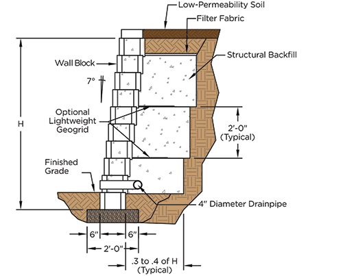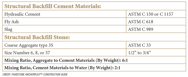 Structural backfill zones are often suitable for "cut" wall applications, where land is carved out of a hillside or roadway and upslope material requires retention. When lot lines, rock outcroppings or other obstructions limit excavation depth for traditional geogrid reinforcement, structural backfill zones can provide support and stability for retaining walls up to 10 feet tall. This construction method eliminates the need for the construction of a mechanically stabilized earth zone behind the wall facing, reducing the need for heavy machinery and additional manpower. The backfill mixture, upon curing, should have at least 25 percent voids, allowing water to drain behind the wall and serving as the drainage zone required by most building codes. Retaining wall systems with structural backfill, like Pavestone's Anchorplex wall system, can be built with smaller equipment, less labor and better production rates than conventional grid-reinforced walls.