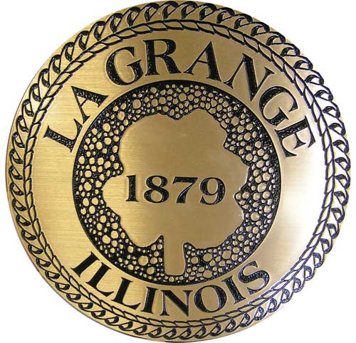 LaGrange signage branding includes cast bronze replicas of the village seal and arched-top CAD/CAM cutout grass motifs, with hand-painted verdigris patinas that evoke the prairie.