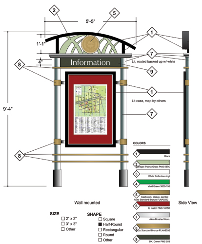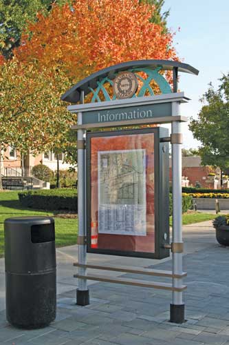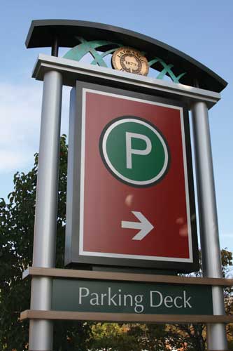 Specified materials for the parking lot entrance signs and informational kiosks included: - Aluminum tube and plate construction finished with AkzoNobel coatings (automobile grade paints); - Cast bronze for the community seal; - Map cases internally lit with fluorescent lamps; - LEDs for the "headers" and parking "P" symbols; - Signfix???(R)???AE???? aluminum extrusions affixed with very high bond tape and stainless steel clamps and strapping to fasten the wayfinding directional signs to the custom aluminum poles, or, in some instances, existing light poles; - Kiosks and parking lot entrance signs installed on concrete footings.