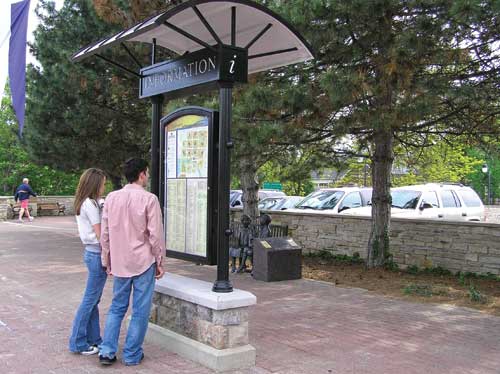 Naperville, Illinois (pop. 141,857) is a western suburb of Chicago located in DuPage and Will counties. Naperville was voted second-best city to live in the U.S. by Money magazine in 2006, and in 2010, named the wealthiest city in the Midwest. A predominantly rural community for most of its existence, Naperville experienced a population explosion starting in the 1960s, but largely during the 1980s and 1990s, following the construction of the East-West Rollway (now known as the Ronald Reagan Memorial Tollway), and Interstate 355 (originally known as the North-South Tollway, now the Veterans Memorial Tollway). In the past two decades, it has nearly quadrupled in size as Chicagoland's urban sprawl brought corporations, jobs and wealth to the area. In the mid-1970s, the city fathers decided to make all parking in downtown Naperville free, an incentive to keep the downtown "alive" in the face of competition with nearby Fox Valley Mall in Aurora, and the subsequent sprawl of strip shopping malls. Parking meters were taken down, and garage parking built in the 1980s and 1990s became free. Parking is also available on major thoroughfares during non-peak hours. Improvements to the streetscape and pedestrian zones in downtown Naperville were done prior to the wayfinding signs, along with parking lot improvements and the construction of several parking decks. The city desired several wayfinding kiosks with downtown and riverwalk business and recreation maps. The kiosks were strategically located close to pedestrian walks, public parking lots and ramps. Two styles of kiosks were designed. The taller kiosks with the arched roofs were located in more open areas; the shorter versions were used where space was limited. In addition, one was designed to be wall mounted.