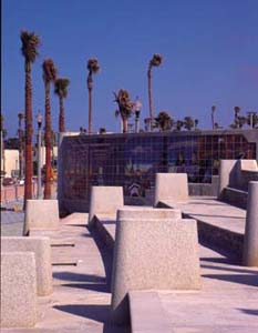 The most difficult challenge in any coastal development project is choosing the best materials for construction. Materials should be selected primarily for their ability to tolerate the difficult coastal conditions that plague most coastal areas. The main difficulty in choosing materials relates to the salt content in the air, combined with the strong offshore winds that can challenge the lifespan of metals and concrete. These conditions, along with the heavy traffic at most beach facilities, can test the durability of any construction material. Specific materials which withstand the salt air, sands, wind and high recreational use are the only option for beach projects. "We had to be very cautious and aware of what the salt air can do to materials used for Pier Plaza," said Pickel. "Among other things, all of the steel within the concrete is epoxy coated, and the stone on the amphitheater and pavement had to be of a particular strength to withstand the high pressure washing the city does."
